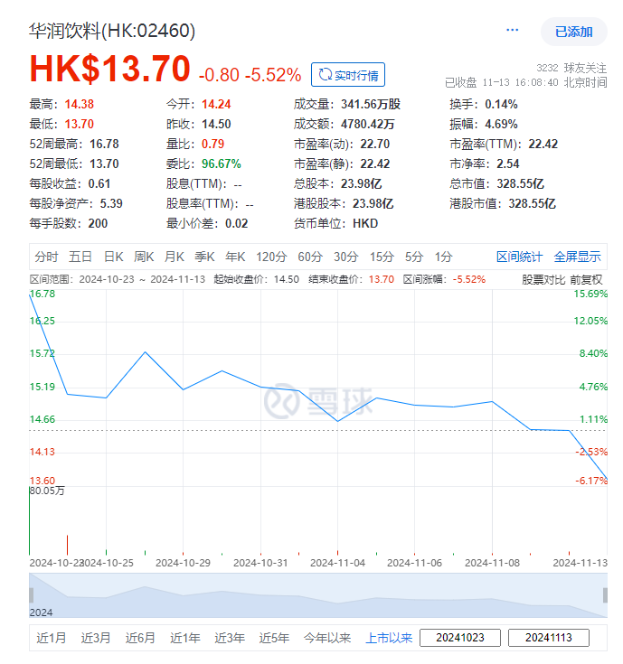 华润饮料,于2024年10月23日在港交所上市,当时全球发售3.478262亿股,每股定价14.50港元,加上此次部分行使超额配股权后,其IPO募资额升至约57.74亿港元。截至周三(11月13日)收市,华润饮料每股报13.70港元,总市值约328.55亿港元。