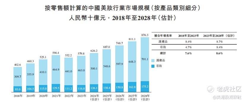 中国美妆行业市场规模持续增长,展现出广阔的发展前景。根据弗若斯特沙利文的资料,按零售额计算,中国美妆行业市场规模从 2018 年的 4,026 亿元增长至 2023 年的 5,798 亿元,复合年增长率为 7.6%,预计到 2028 年将达到 8,763 亿元,2023 - 2028 年复合年增长率为 8.6%。其中,高端美妆市场增长尤为迅速,按 2023 年零售额计算,前五大高端美妆集团占据 55.4% 的市场份额,且均为国际美妆集团,公司作为中国第七大高端美妆集团,有望受益于行业增长趋势,进一步扩大市场份额。