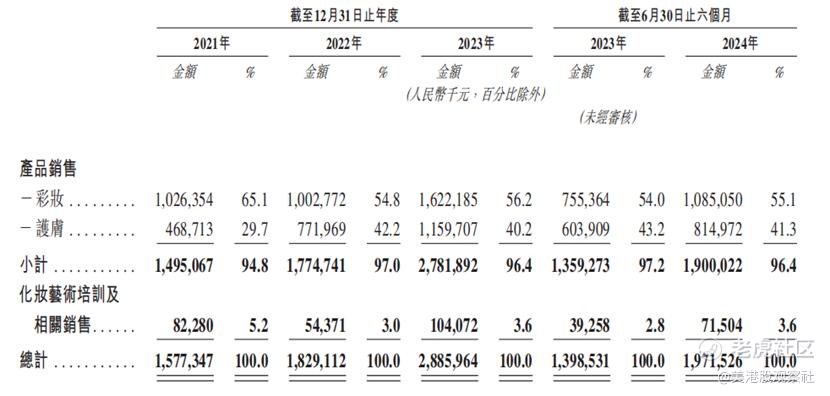 公司收入呈现快速增长态势,2021 年总收 1,577.3 百万元,2022 年增至 1,829.1 百万元,2023 年进一步提升至 2,886.0 百万元,2021 - 2023 年复合年增长率达 35.3%。截至 2024 年 6 月 30 日的前六个月收入为 1,971.5 百万元,较 2023 年同期增长 41.0%。产品销售收入是主要收入来源,其中彩妆和护肤品销售收入占比较大,且在报告期内保持增长趋势。线上和线下渠道销售均实现显著增长,线上渠道销售增长尤为突出,2021 - 2023 年复合年增长率达 49.3%,显示出公司在电商领域的强劲发展势头。
