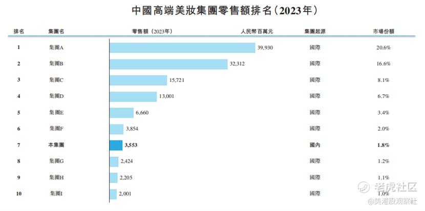 自 2000 年成立以来,公司取得了显著成绩。根据弗若斯特沙利文的资料,公司是中国市场十大高端美妆集团中唯一的中国公司,按 2023 年零售额计算排名第七,市场份额为 1.8%。公司旗舰品牌 MAOGEPING 更是中国市场十五大高端美妆品牌中唯一的国货品牌,在行业内树立了良好的品牌形象,展现出强劲的发展势头。