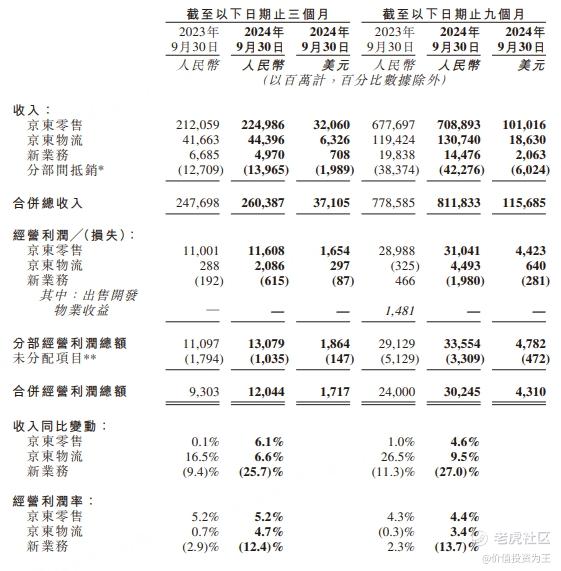 不过,从细分业务的利润情况来看,三季度超预期的主要动力来自物流,当季经营利润20.86亿,经营利润率达到4.7%,远高于去年同期的0.7%;而核心主业京东零售三季度经营利润率为5.2%,与去年同期持平: