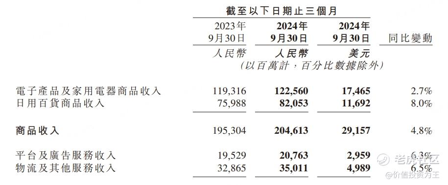 若安排产品类型划分,三季度电子产品及家用电器营收1225.6亿,同比增长2.7%,略超分析师预期的2035亿;日用百货营收820.5亿,同比增长8%,不及分析师预期的827亿;广告及物流收入同样不及分析师预期: