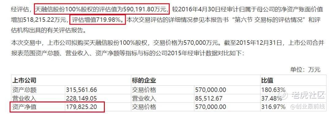 根据中企华出具的资产评估报告,在评估基准日2016年4月30日,天融信科技100%股权评估价值为59.02亿元,较其经审计的母公司账面净资产价值7.20亿元,增值率达到719.98%。截至2015年12月31日,南洋股份的资产净值甚至不足20亿元。