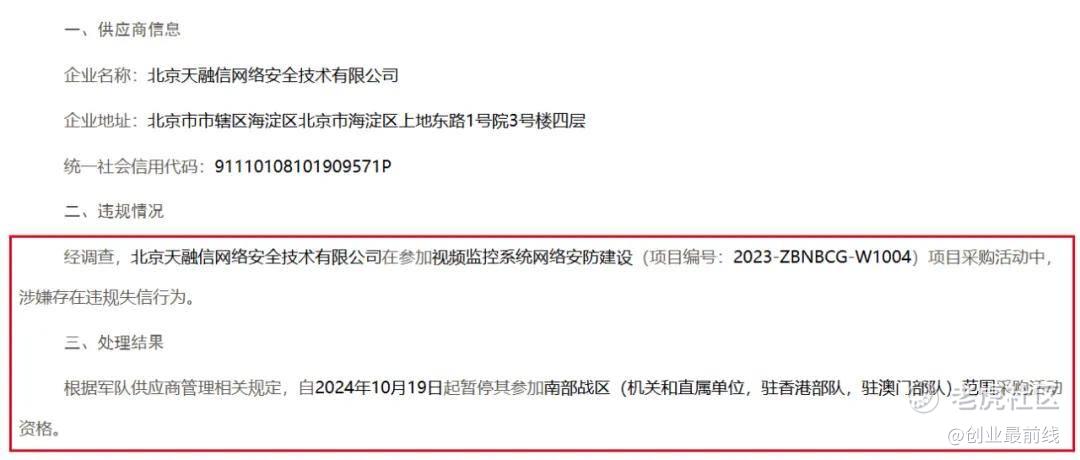 值得注意的是,军队采购网发布的消息显示,北京天融信网络安全技术有限公司(以下简称:北京天融信)在参加视频监控系统网络安防建设项目采购活动中,涉嫌存在违规失信行为。