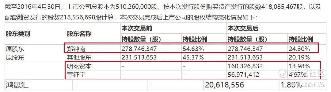 公开资料显示,本次交易前,郑钟南持有南洋股份54.63%股权,交易完成后,考虑配套融资新增股份的影响,郑钟南持有上市公司的股份降至24.30%,而郑钟南实际控制的鸿晟汇持有了1.80%股权,郑钟南仍为控股股东。