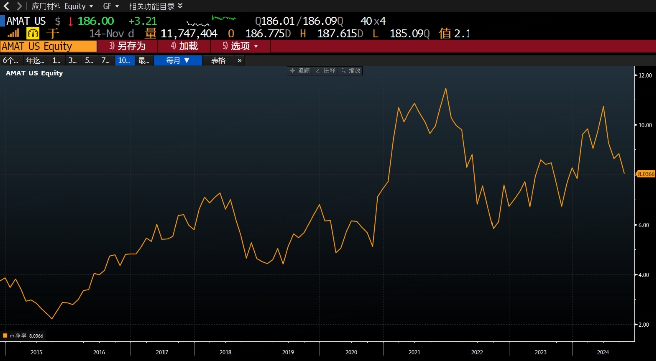 按照周期股市净率估值计算,应用材料当前为8倍,处于10年来较高位置: