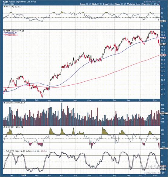 伊格尔矿业可能是全球最好的金矿公司。它比竞争对手执行得更好,可能拥有最好的管理团队,并且前景非凡。因此,这里的抛售幅度较小,股票仅从最近的高点下跌了约17%。尽管如此,伊格尔矿业几乎超卖,因为RSI接近30,其他技术指标也在下降。