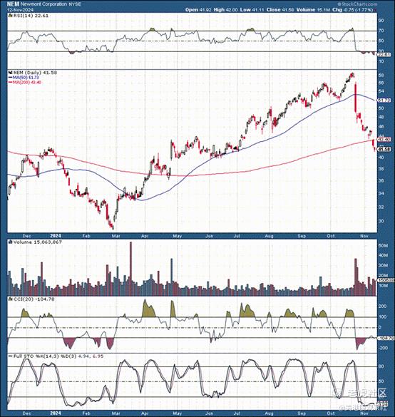 纽蒙特矿业在这里严重超卖,跌破200日移动平均线,RSI约为22。其他技术指标如CCI和全随机指标显示高度超卖的技术图像,暗示着很快可能会有相当大的反弹。