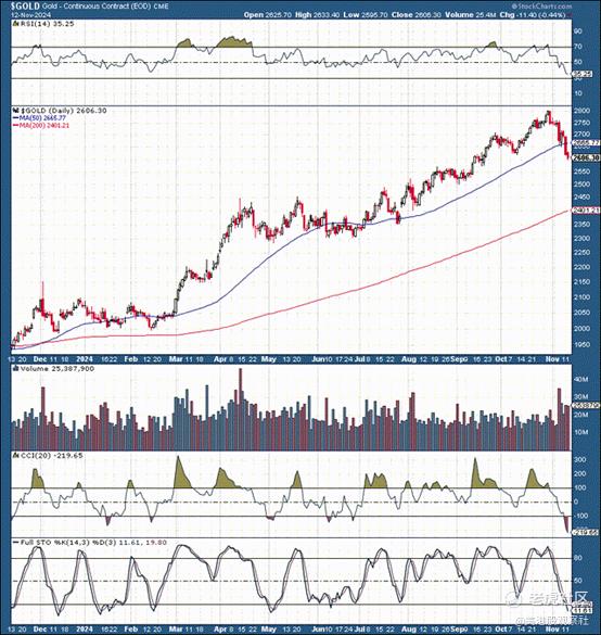 美元指数从大约100飙升至106,由于特朗普的胜利,美元获得了显著的强势。这种动态最近对黄金价格不利,因为黄金以美元计价,更昂贵的美元使得黄金在其他货币中更加昂贵。