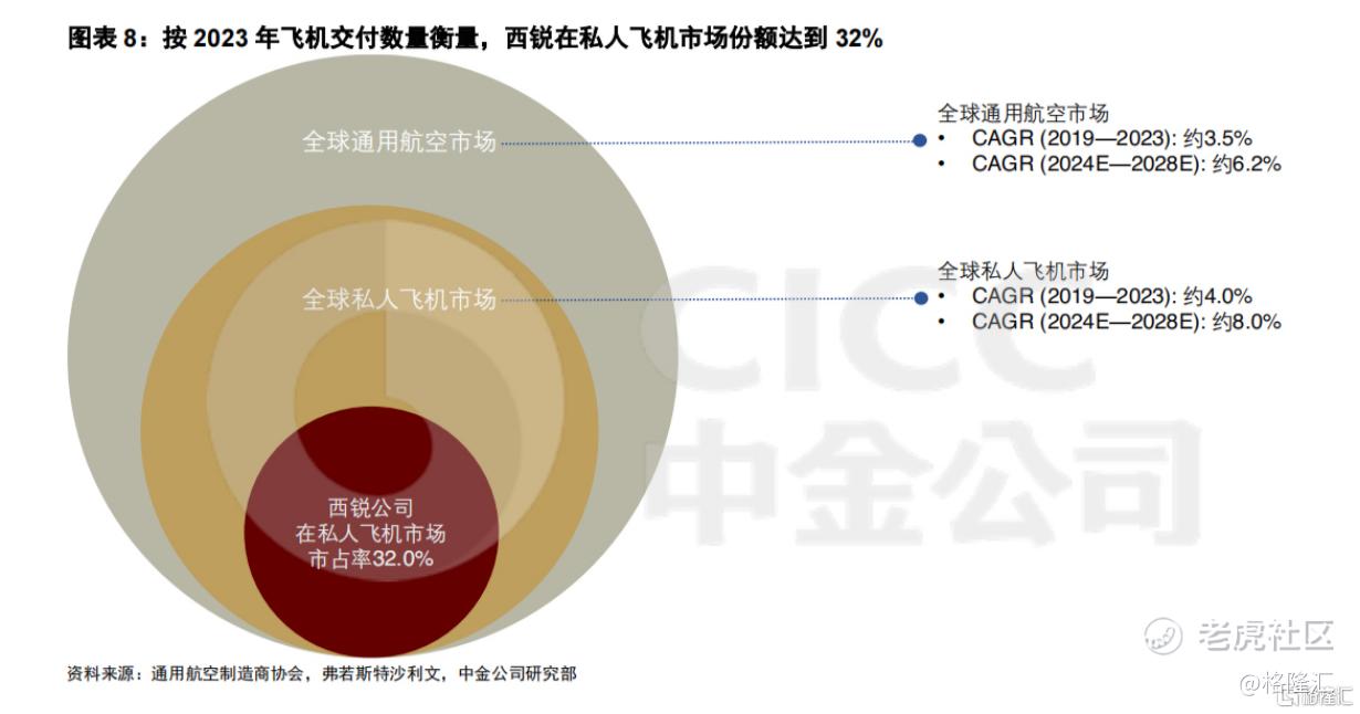 这也是中金公司看好西锐的原因所在。西锐作为行业的领导者,其在高复利效应的赛道中展现出了卓越的竞争力。2023年西锐交付了708架飞机,按交付数量计算,在通用航空和私人航空市场中的份额分别达到了23.2%和32.0%,这一成绩充分证明了西锐在行业中的领先地位。