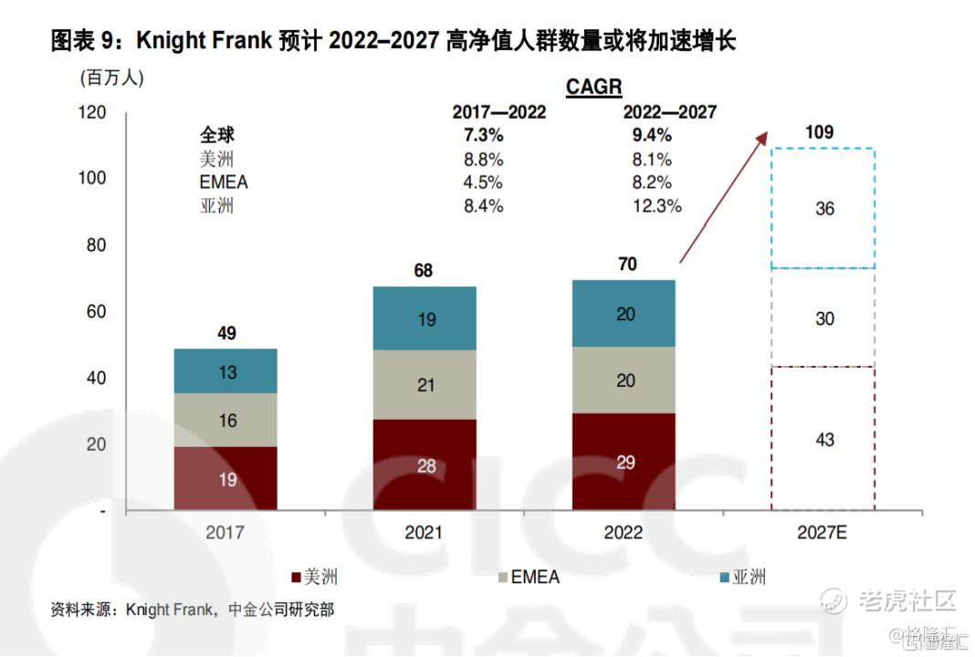分地区来看,亚洲地区的高净值用户的增长速度最为迅猛,显示出巨大的增长潜力。自2008年全球金融危机以来,亚洲国家的高净值人群数量急剧上升。根据Knight Frank的预测,到2027年全球超高净值人群的数量将突破74万大关,其中亚洲地区的年平均复合增长率预计将高达12%,远超全球平均水平。