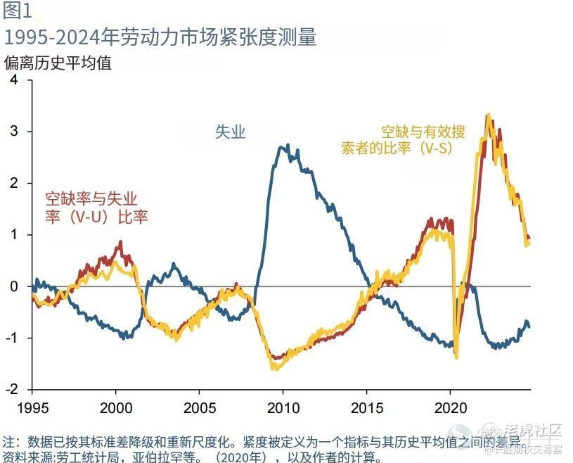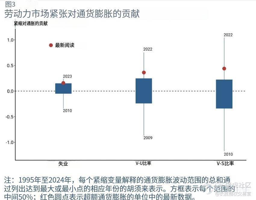 图 3 显示了 1995 年至 2024 年期间以失业率以及 V-U 和 V-S 比率衡量的劳动力市场紧缩对过度通胀的贡献。劳动力市场紧缩在
