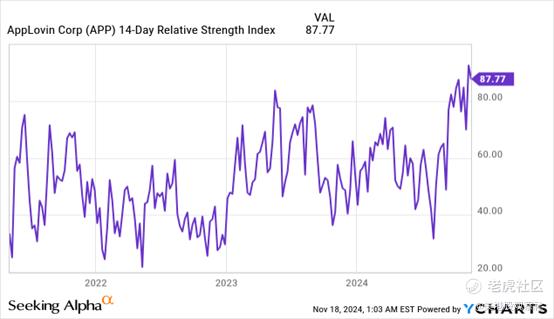 在第三季度财报发布后,APP的股价在过去几周内飙升了73%。股票极度超买,14天RSI指标为87.8,表明FOMO因素非常强烈。上涨势头急剧降温的风险大幅增加了。