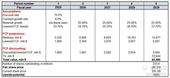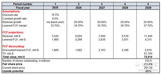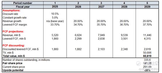 第一种情景非常激进,AppLovin很难实现这些增长预测。对于第二种情景,仍然加入激进的6%恒定增长率,但到2029财年的收入CAGR为20%。第二种情景仍然很激进,公平的股价是216美元。