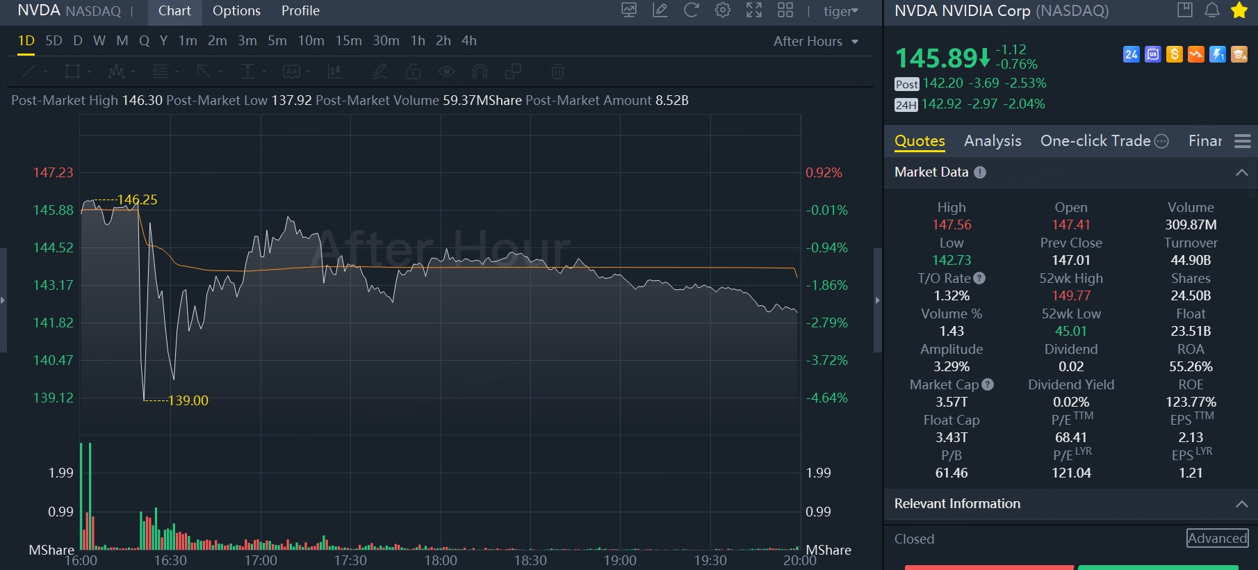 导致盘后股价下跌的主要原因是市场预期太高了,英伟达给出的指引是营收在375亿美元左右,高于分析师预期的371亿中值!由于超预期幅度不够大,加上英伟达年内股价涨幅巨大,估值处于历史高位,因此,每次超预期财报发布之后,英伟达的股价都很难大涨!