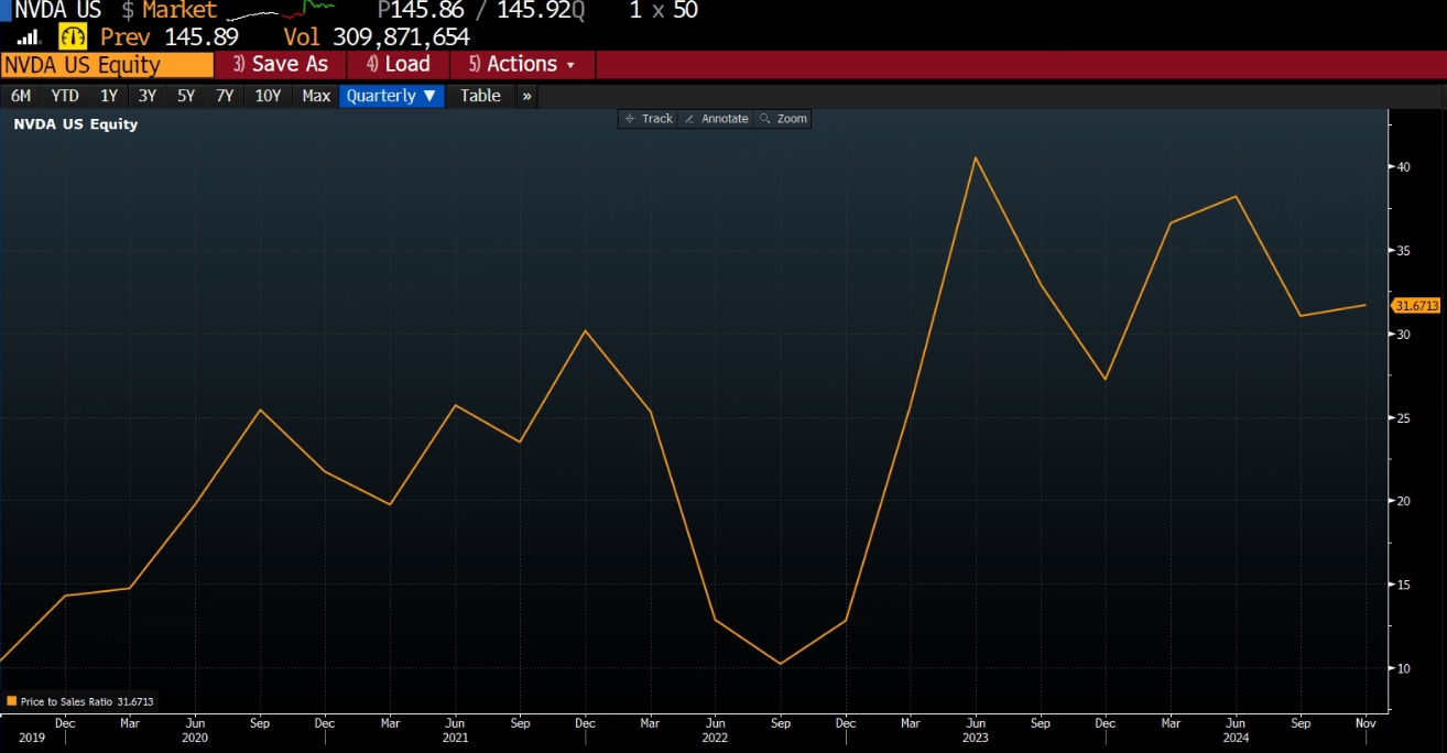 比如英伟达2025财年营收或达到1287亿美元,按照目前的市值算,市销率为28倍,低于2021年半导体大牛市高点时30倍的估值: