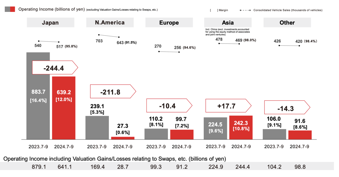 即便部分车辆利润被计入日本本土,北美部门的低效率也显而易见。此外,其他地区的盈利能力也普遍下降,全球市场面临的综合压力显著增加。
