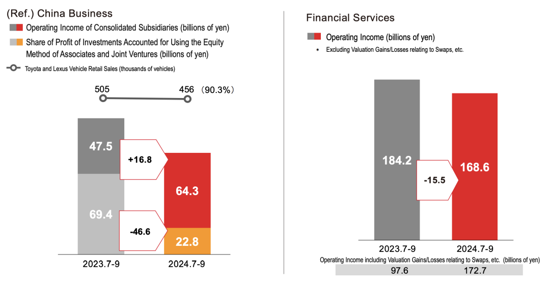 丰田在中国子公司营业利润为643亿日元,权益收入为228亿日元,车辆销售为45.6万台,同比下降9.7%。