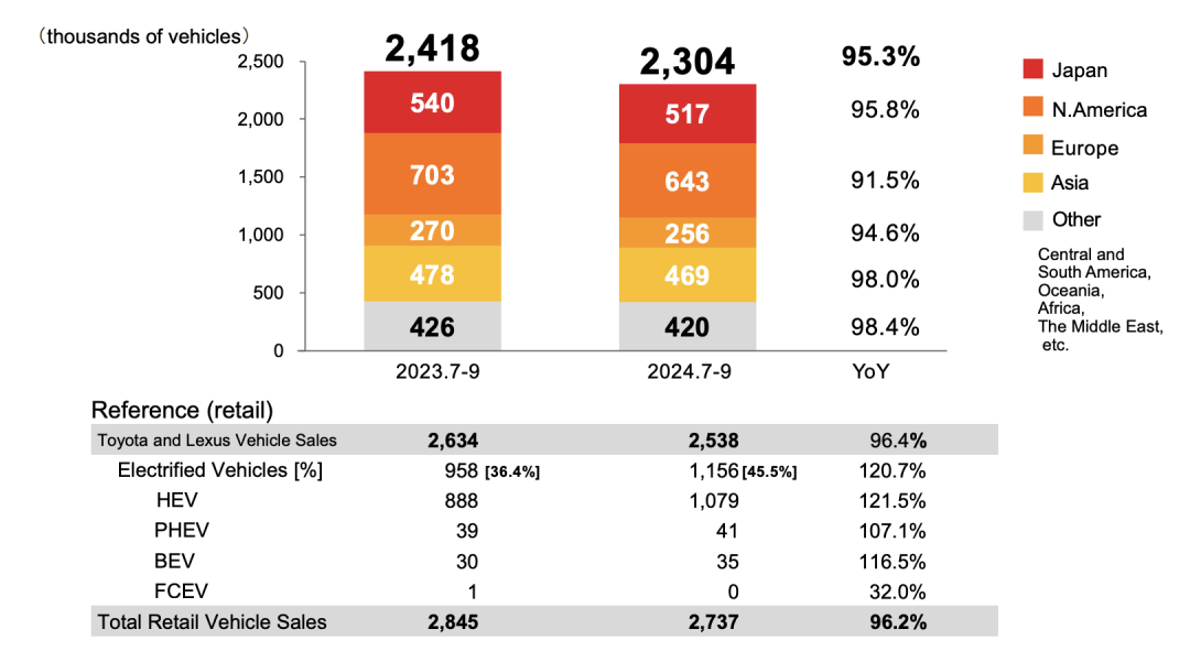 丰田2024年第三季度全球销量为253.8万辆(全口径的零售是273.7万台),同比下降3.6%。以下是主要市场的表现: