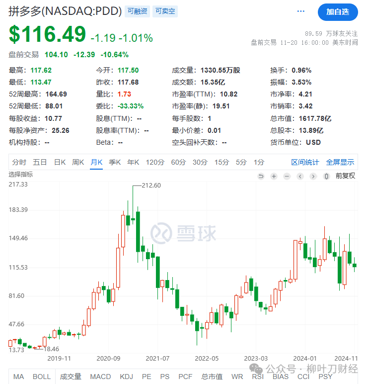 盘前显示,拼多多要跌10%-11%。而从目前看,PDD的市盈率只有10.82。我其实特别好奇的是,对于一个营收增速44%,利润增速61%的企业,给10倍市盈率这是否合理。