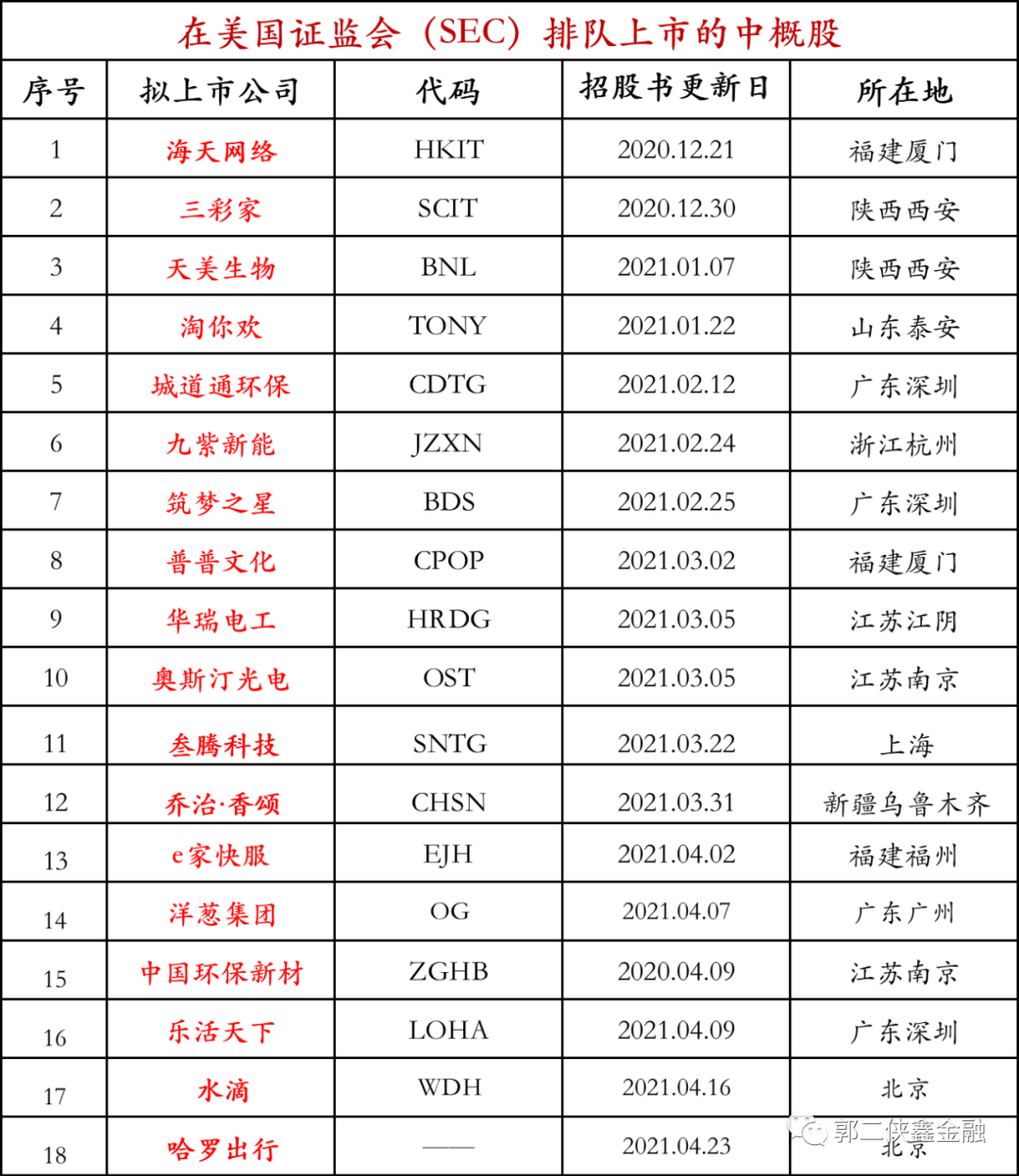 据郭二侠统计,目前在美国证监会(SEC)递交招股书的拟上市中国企业,至少有18家。