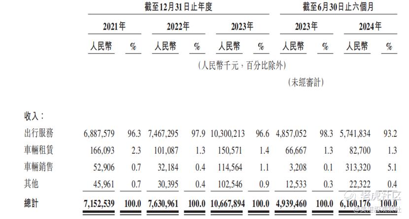 公司收入来源多元化。2021 - 2023 年及截至 2024 年 6 月 30 日,出行服务收入占比均超 90%,是主要收入支柱。2023 年,出行服务收入达 103 亿元,占总收入 96.6%。车辆租赁和销售业务收入也逐年增长,2023 年车辆租赁收入 1.51 亿元,车辆销售收入 1.15 亿元,分别占总收入 1.4% 和 1.1%。其他服务收入包括广告、同城配送及为吉利集团提供的一次性服务等,2023 年其他服务收入 1.03 亿元,占总收入 0.9%。