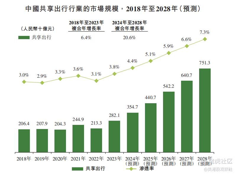 中国出行市场规模庞大且增长迅速。2023 年,出行市场规模达 7.5 万亿元,共享出行服务市场规模 2821 亿元,渗透率 3.8%。预计到 2028 年,共享出行市场规模将增至 7513 亿元,复合年增长率 20.6%,市场渗透率有望提升至 7.3%。这为曹操出行提供广阔发展空间,也吸引众多参与者,加剧市场竞争。