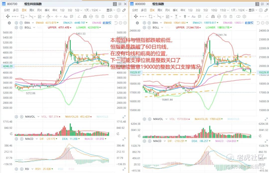 上周分析时,恒指已经跌破窄幅盘整下边线,但恒科不确定,依据道氏理论,区间窄幅震荡的突破需两个指数同时出现突破确认结论方可靠。