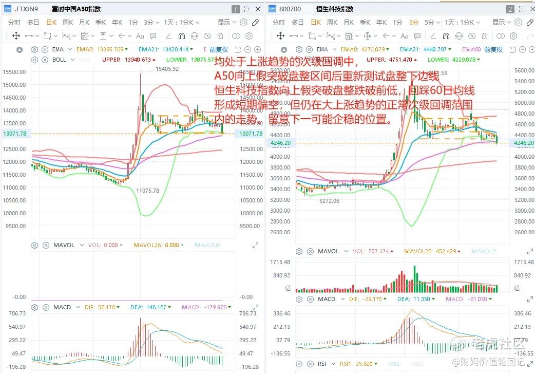 从截图可看出, $A50 sz159601$ 与恒生科技指数日线图整体仍处于上涨趋势的次级回调中,目前A50向上假突破之前持续了三周的盘整区间后重回区间震荡,开始第三次测试盘整下边线。