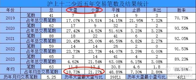 上表中的胜率是按不亏就算胜来算的,若按赚钱才算胜,那么十二少近五年平均胜率就是大盈+小盈的占比=18.73%+21.27%=40%。