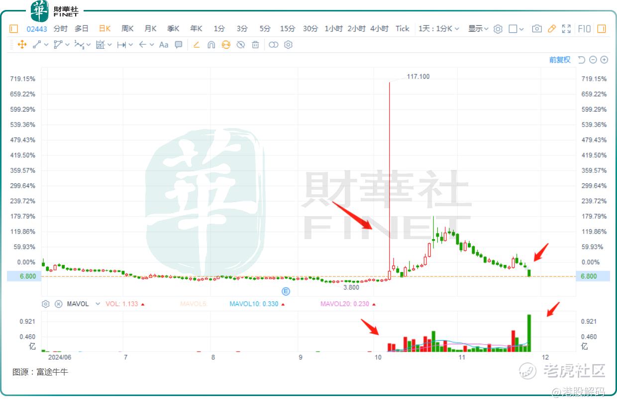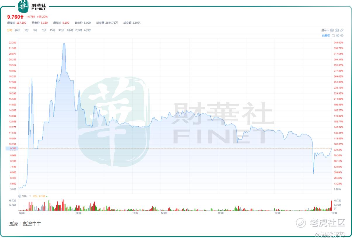 随后迎来一波比较平淡的走势,直到10月8日,汽车街突然迎来暴力拉升,盘中一度涨逾340%,然后快速调整,最终收涨95.20%,成交额放大至3.59亿港元。