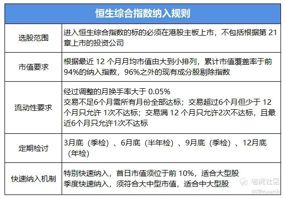 根据港股通纳入标准可以发现,除了A+H公司外,港股上市公司需要先被选入恒生综合指数才有进入港股通的资格。下图展示了恒生综合指数的纳入标准,只有满足一定市值规模和流动性要求的公司才能够被纳入恒生综合指数。