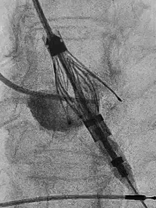 患者全麻后植入Safari预塑弯导丝,猪尾根部造影后,置换MP导管,使用TaurusTrio THV27进行植入,首先将TaurusTrio 导引鞘推进到STJ上方。输送系统装载27规格瓣膜,到达STJ上初始释放位,回撤长鞘到降主动脉位置。使用调弯功能调整轴向,推进1cm展开定位键后,调整DSA验证定位键位置,可进行整体旋转瓣膜进行瓣窦对齐,确保在coplanar View三个定位键与原生窦对齐,推进瓣膜使定位键进入窦底,逐一造影验证后,在起搏下释放。完成植入后造影结果显示重度主动脉反流消失,无瓣周漏,瓣膜释放形态较理想,且释放后无新发起搏器植入指征,顺利结束手术。