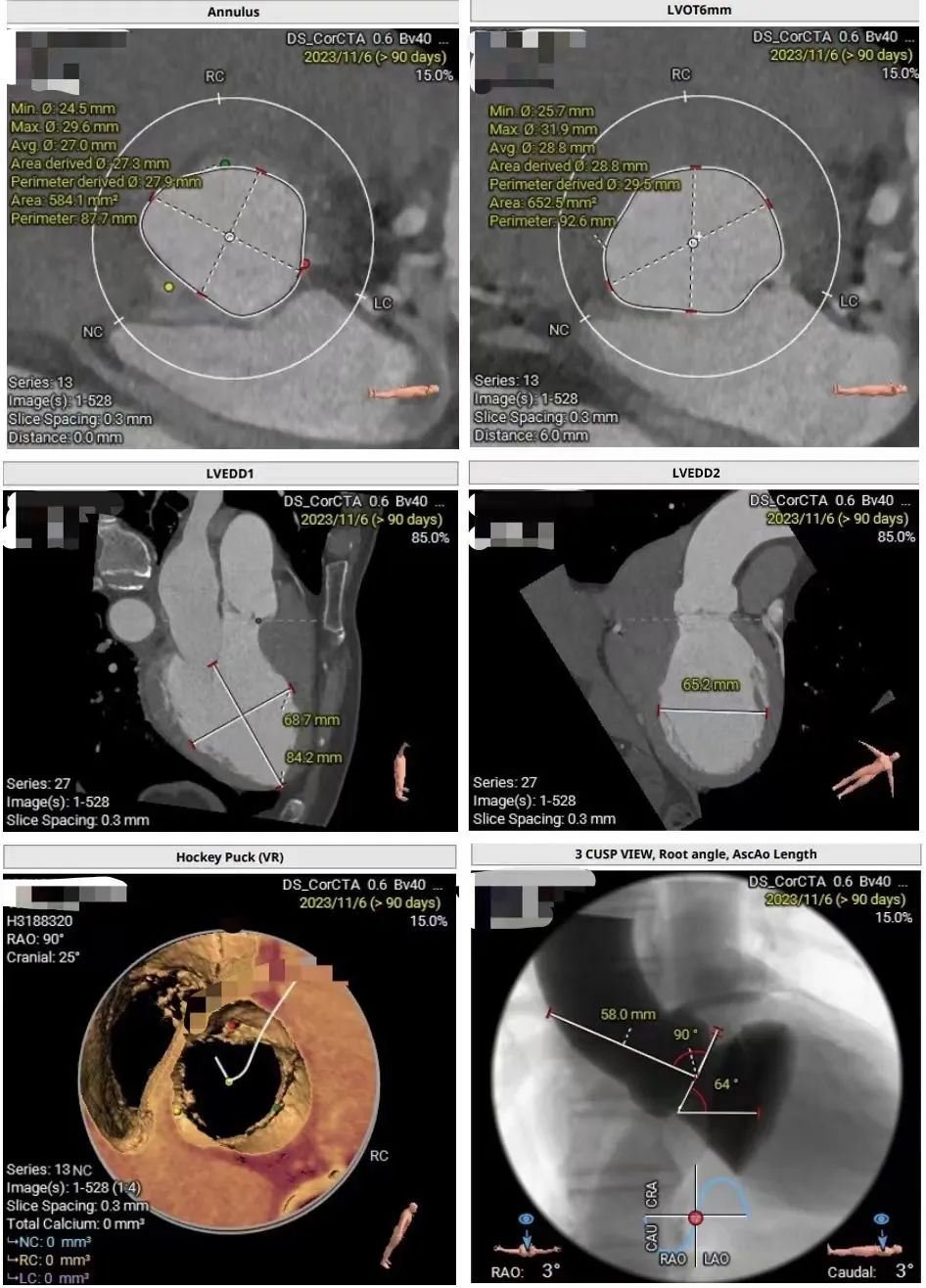 术前CT评估显示,瓣环周长为87.7mm (oversize: 7.5%),LVOT 92.6cm(oversize: 9.9%),呈敞口型。VR相显示主动脉根部无钙化。瓣环水平夹角64°。外周入路条件良好,术前策略讨论拟使用右窦中心位进行瓣膜定位及释放。