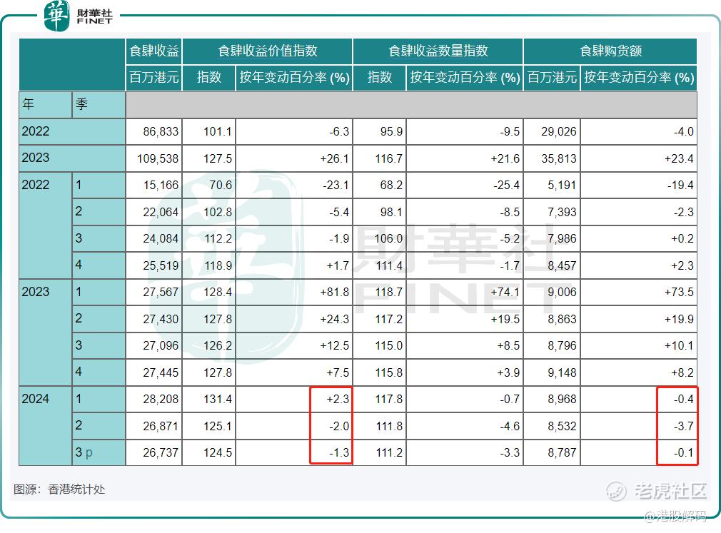 受2022年低基数影响,香港2023年全年的食肆总收益价值增长迅猛,但2023年四季度开始,港人北上消费愈加活跃,同时叠加外地旅客消费模式转变影响,食肆总收益价值的增速开始放缓以至负增长。今年二季度和三季度,食肆总收益价值已连续两个季度录得负增长。