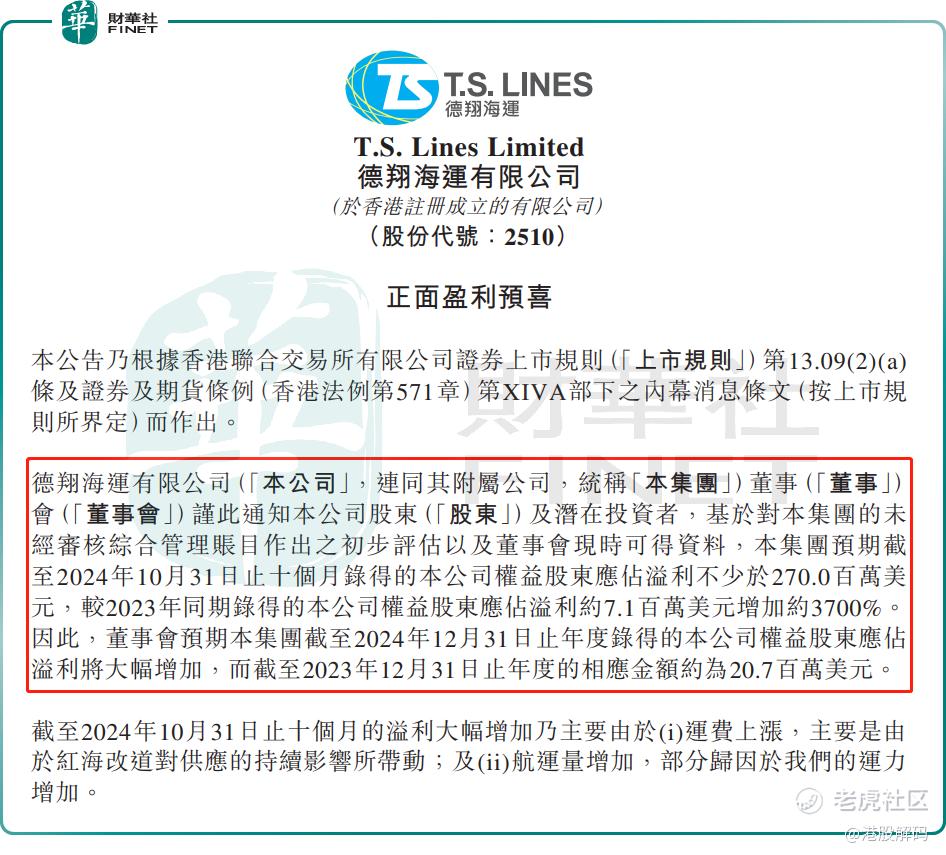 11月29日, $德翔海运(02510)$ 发盈喜公告后,股价大幅高开13.88%,截至发稿前,该股涨幅收窄至3.35%,报4.32港元/股。
