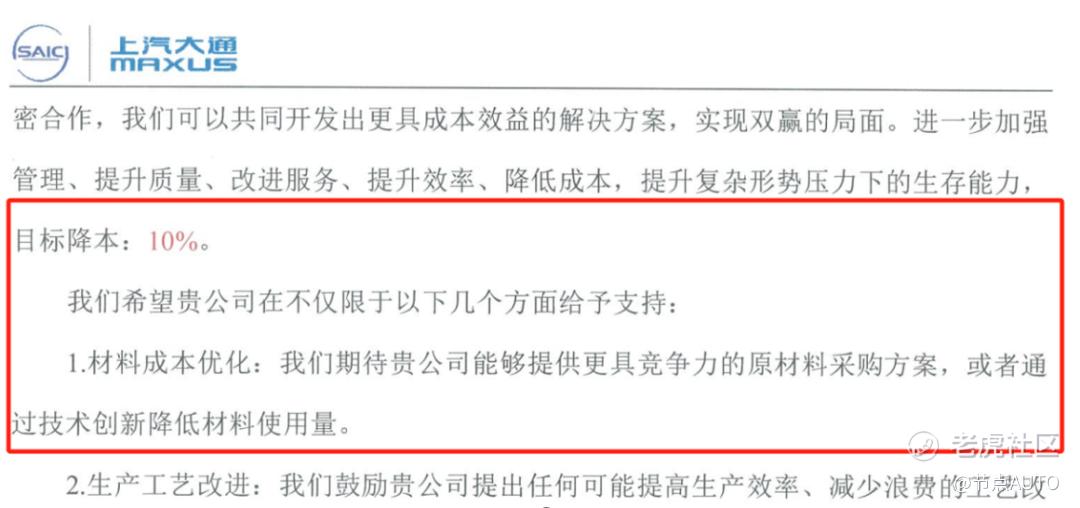 在比亚迪要求降价的前2天,上汽大通25日也向其供应商致信称,进一步加强管理、提升质量、改进服务、提升效率、降低成本,提升复杂形势压力下的生存能力,目标降本:10%。