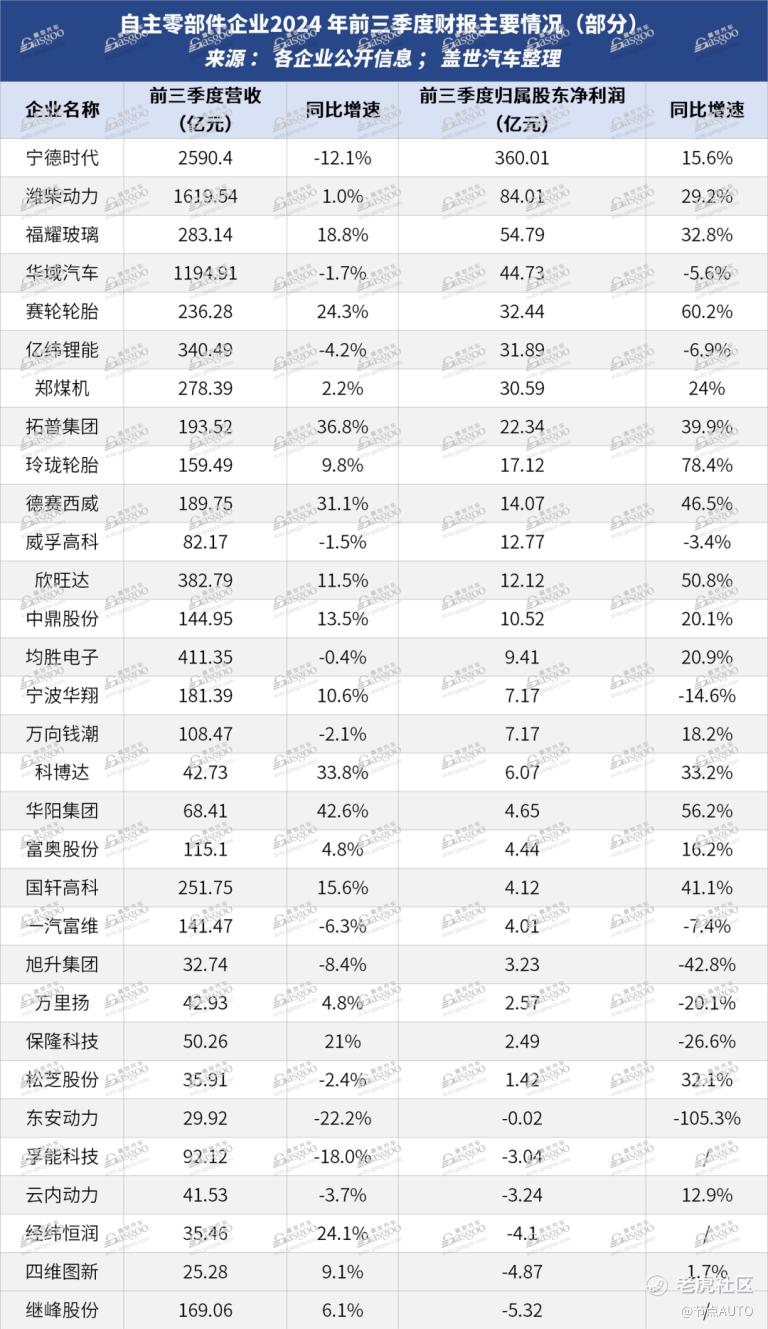 据同花顺iFinD数据统计显示,截至10月29日,共123家汽车零部件上市公司披露三季报,从营收增速看,前三季度86家营收呈正增长态势,占比69.92%;从净利增速看,79家净利呈正增长态势,占比64.23%。