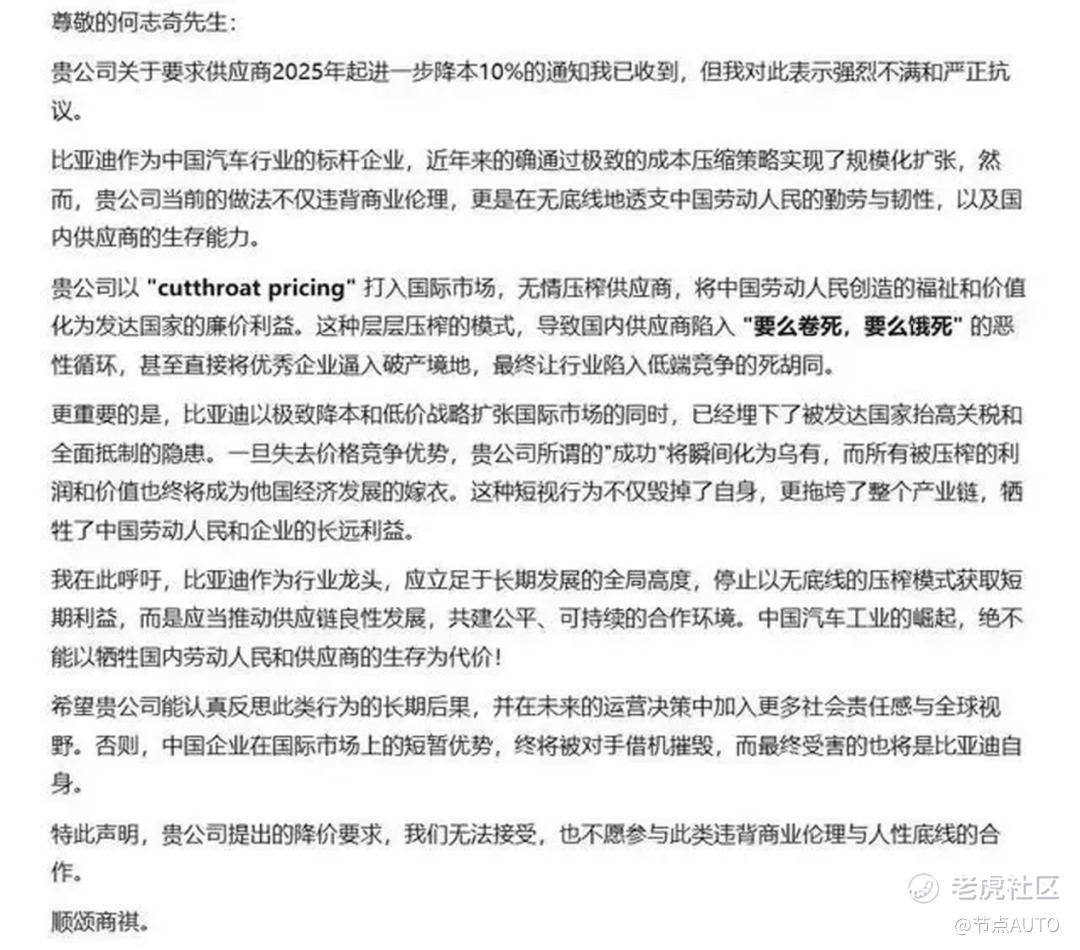 这名供应商称:“比亚迪作为中国汽车行业的标杆企业,近年来的确通过极致的成本压缩策略实现了规模化扩张。然而,公司当前的做法不仅违背商业伦理,更是在无底线地透支中国劳动人民的勤劳与韧性,以及国内供应商的生存能力。这种层层压榨的模式,导致国内供应商陷入‘要么卷死,要么饿死’的恶性循环,甚至直接将优秀企业逼入破产境地,最终让行业陷入低端竞争的死胡同。”