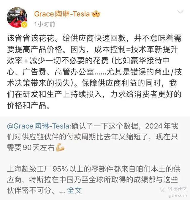 11月28日,特斯拉对外事务副总裁陶琳在微博发文称:“2024年我们对供应链伙伴的付款周期比去年又缩短了,现在只需要90天左右,上海超级工厂95%以上的零部件都来自咱们本土的供应商,特斯拉在中国乃至全球所取得的成绩都与这些伙伴密不可分。”