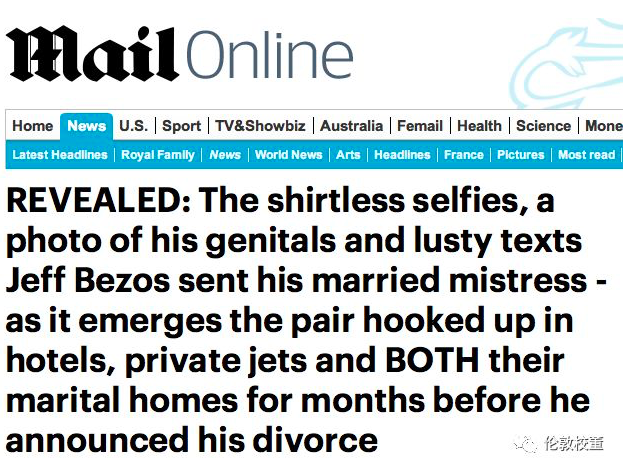 爆料:赤裸裸的上身自拍照、生X器照片,以及杰夫·贝佐斯发给已婚情妇的露骨短信——而这一切,都在贝佐斯宣布离婚之前发生的,照片摄于两人厮磨过的酒店、私人飞机,以及他们各自的家里,两人的婚外情已经8个月了。先简单再复习一下全球首富、亚马逊总裁贝佐斯婚内出轨的新闻: