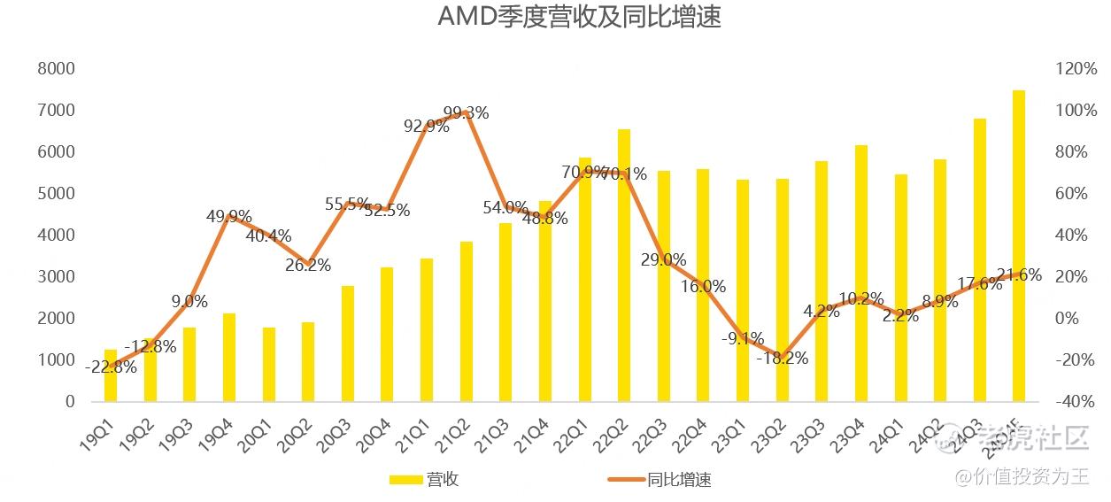 加上除了数据中心业务外, AMD的游戏及嵌入式业务刚好处于低谷,导致整体营收增速不够吸引人,三季度仅有18%的增长,预计四季度只有22%:
