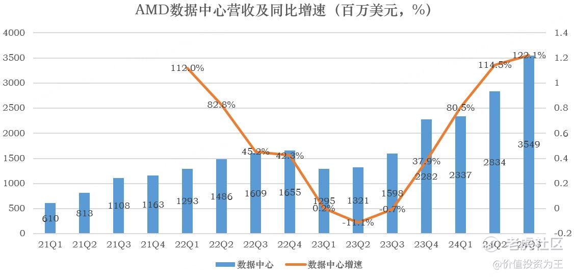 与自身相比,AMD倒也从AI中也受益颇多,今年三季度数据中心营收达到35.5亿,同比暴增122%: