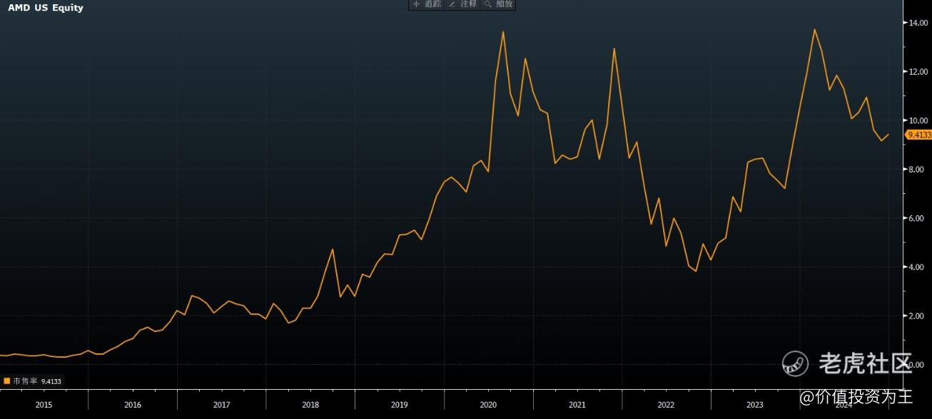 更高的盈利能力,意味着更高的估值倍数,因此,当AMD摆脱传统的PC周期束缚、整体盈利能力在数据中心带动下发生质变后,未来的PS估值有望再上一个台阶: