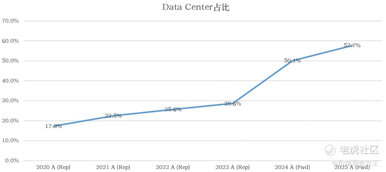 根据分析师的预测,2025年,数据中心的营收占比有望从AI爆发前的28.6%提升至57.7%: