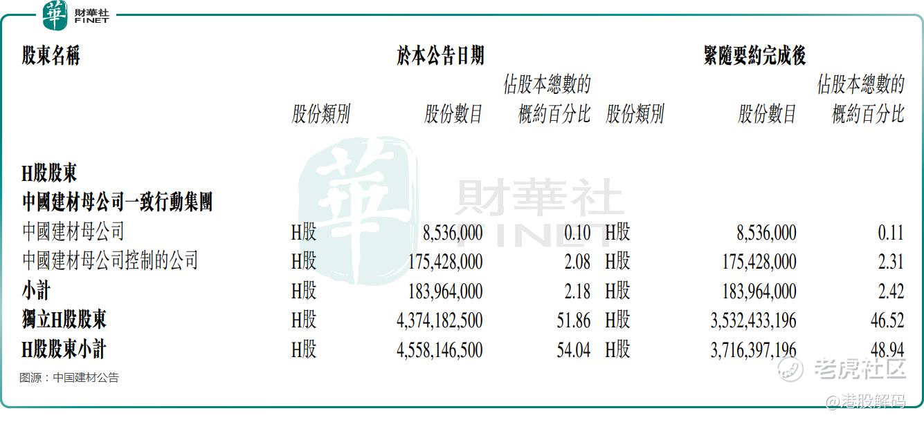 公告显示,H股股东中,中国建材母公司一致行动集团的持股比例较低,绝大部分H股都在独立H股股东手中。