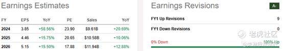 收益预估持续上升,今年的每股收益从年初的约2.80美元上升到今天的3.85美元。这是约38%的增长,非常令人印象深刻。所有九个最近的修订都是上调的,所以这里的销售和每股收益预估看起来非常好。