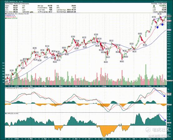 图表中标记了一个自11月初开始形成的负背离。也就是说,价格创出新高,而动量并未跟随。股价继续创出历史新高,但PPO和CMF指数却稳步下降。这并不保证什么,但确实使得我们更有可能看到一个短期顶部,随后是一些卖出或整合。