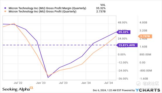 对下一代具有人工智能功能的内存产品的预期需求激增,可能会导致美光的毛利率上升,而美光的毛利率已经处于上升趋势。在最近一个季度,美光的毛利率为35%,而三年平均毛利率为15.8%。与三年平均水平相比,美光的毛利率已经翻了一番,根据该公司对25年第一季度的预测,这家内存制造商预计利润率将连续增长至39.5%。