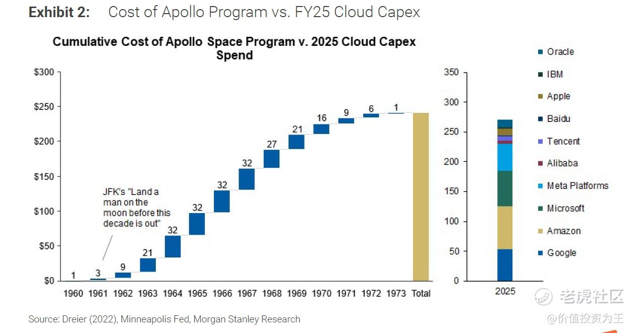 从投入规模来看,分析师预计2025年科技巨头在云计算上的资本开支总额将媲美阿波罗太空计划整整14年的支出: